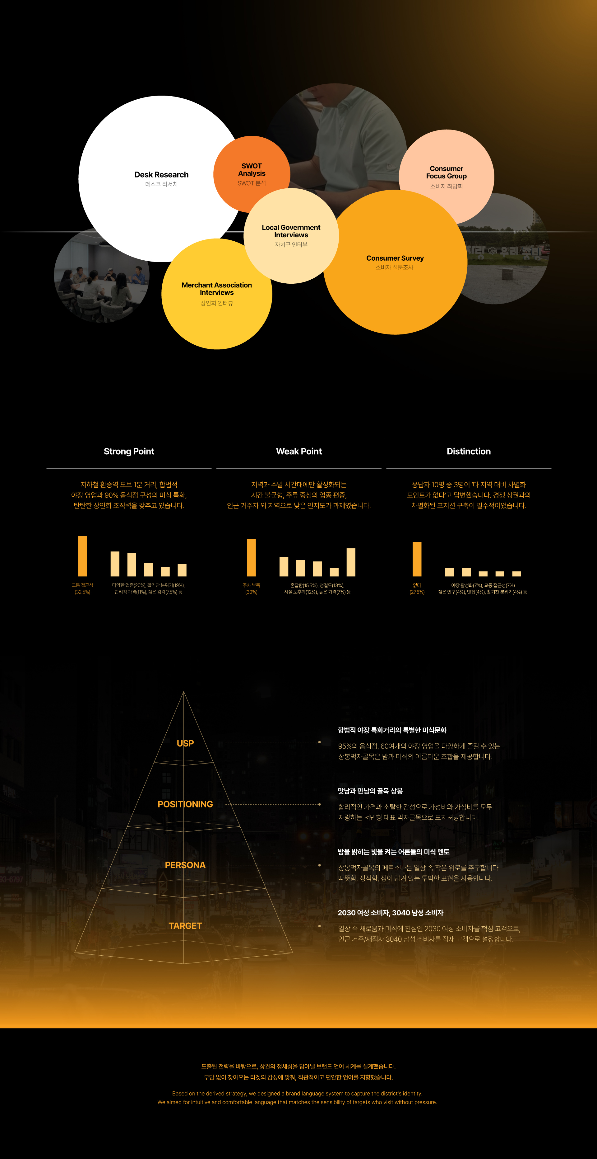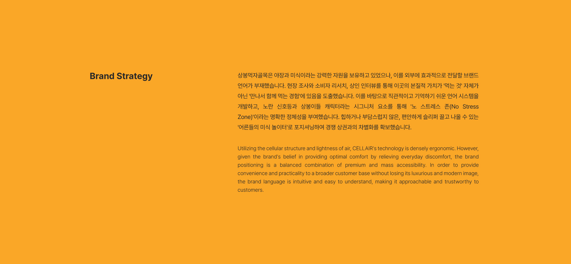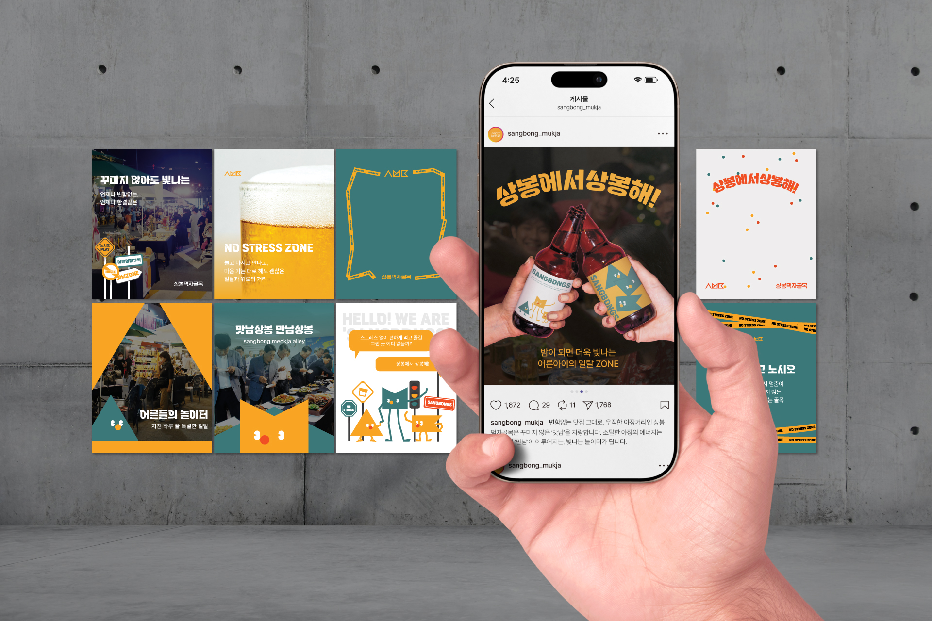 상봉먹자골목은 서울 3호선 상봉역에서 도보 1분 거리에 위치한 미식 특화 골목형 상점가입니다. 서울시 로컬 브랜드 상권육성사업 4기의 일환으로 본 프로젝트가 진행되었으며, 야장 특화거리라는 법적 지위를 확보하고 있음에도 외부 인지도가 낮아 신규 고객 유입이 제한적이었습니다. 본 프로젝트는 이미 활성화된 상권의 강점을 극대화하여, 일상의 스트레스를 내려놓고 소중한 사람과 만나는 '노 스트레스 존(No Stress Zone)'이라는 정체성을 구축하는 데 집중했습니다.