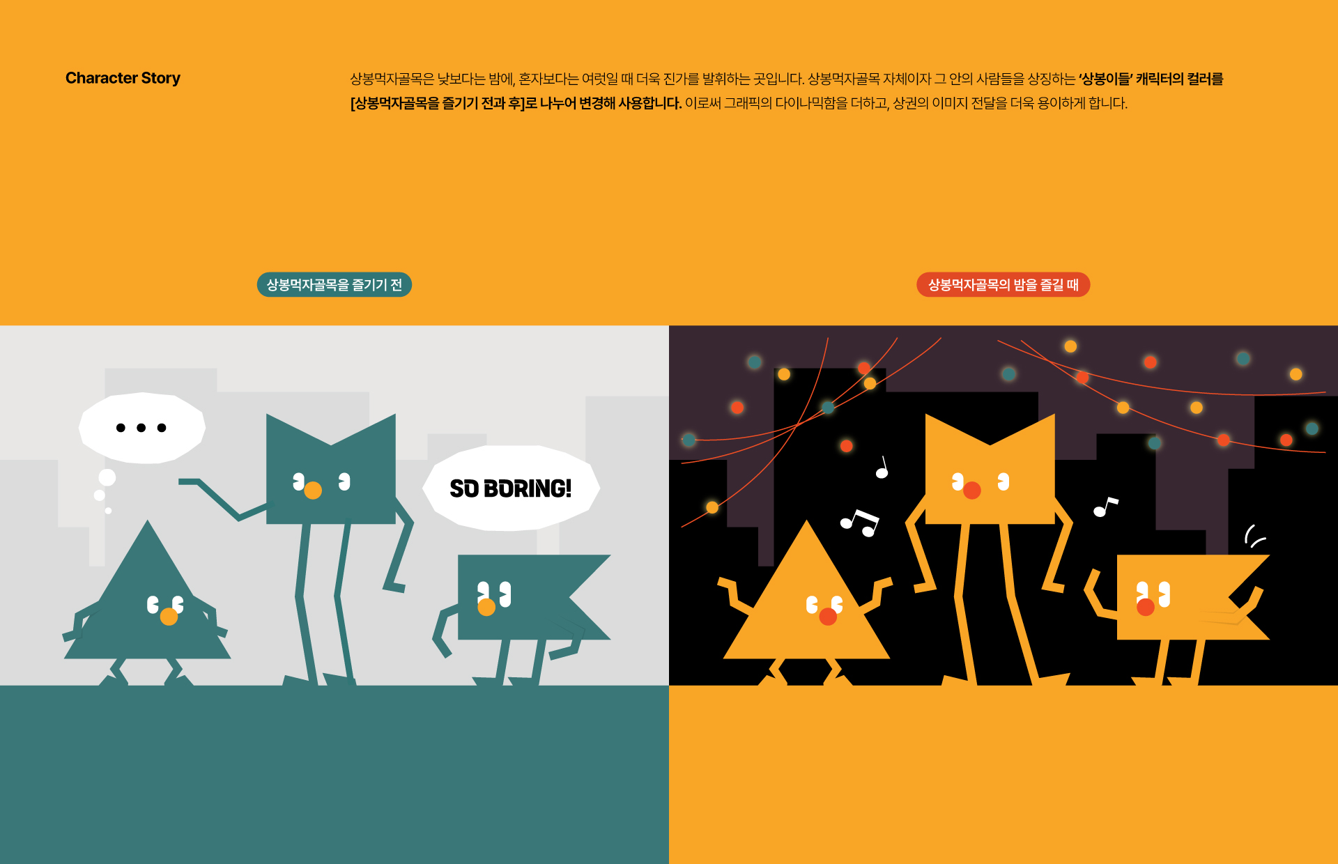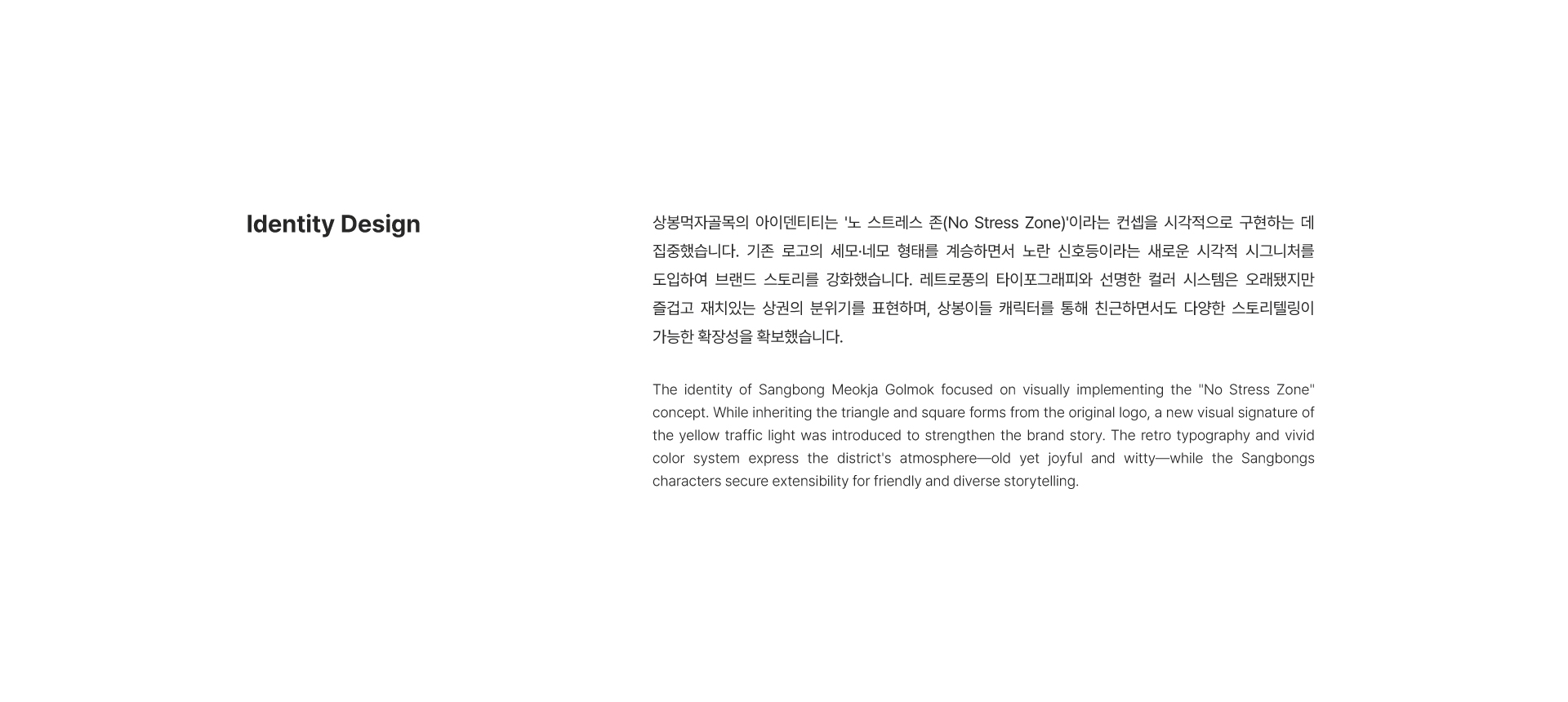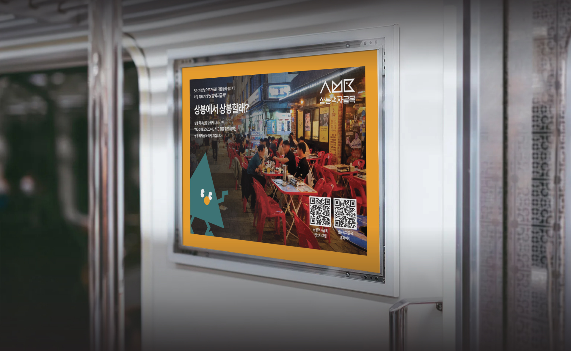 Sangbong Meokja Golmok is a food-specialized alley district located just one minute on foot from Sangbong Station on Seoul Metro Line 3. This project was carried out as part of the Seoul Metropolitan Government's Local Brand Commercial District Development Project (Phase 4). Despite its legal designation as a specialized outdoor dining street, the district suffered from low external recognition and limited new customer acquisition. The project focused on maximizing the district's existing strengths and establishing an identity as a "No Stress Zone" — a place to set aside everyday stress and meet loved ones.
