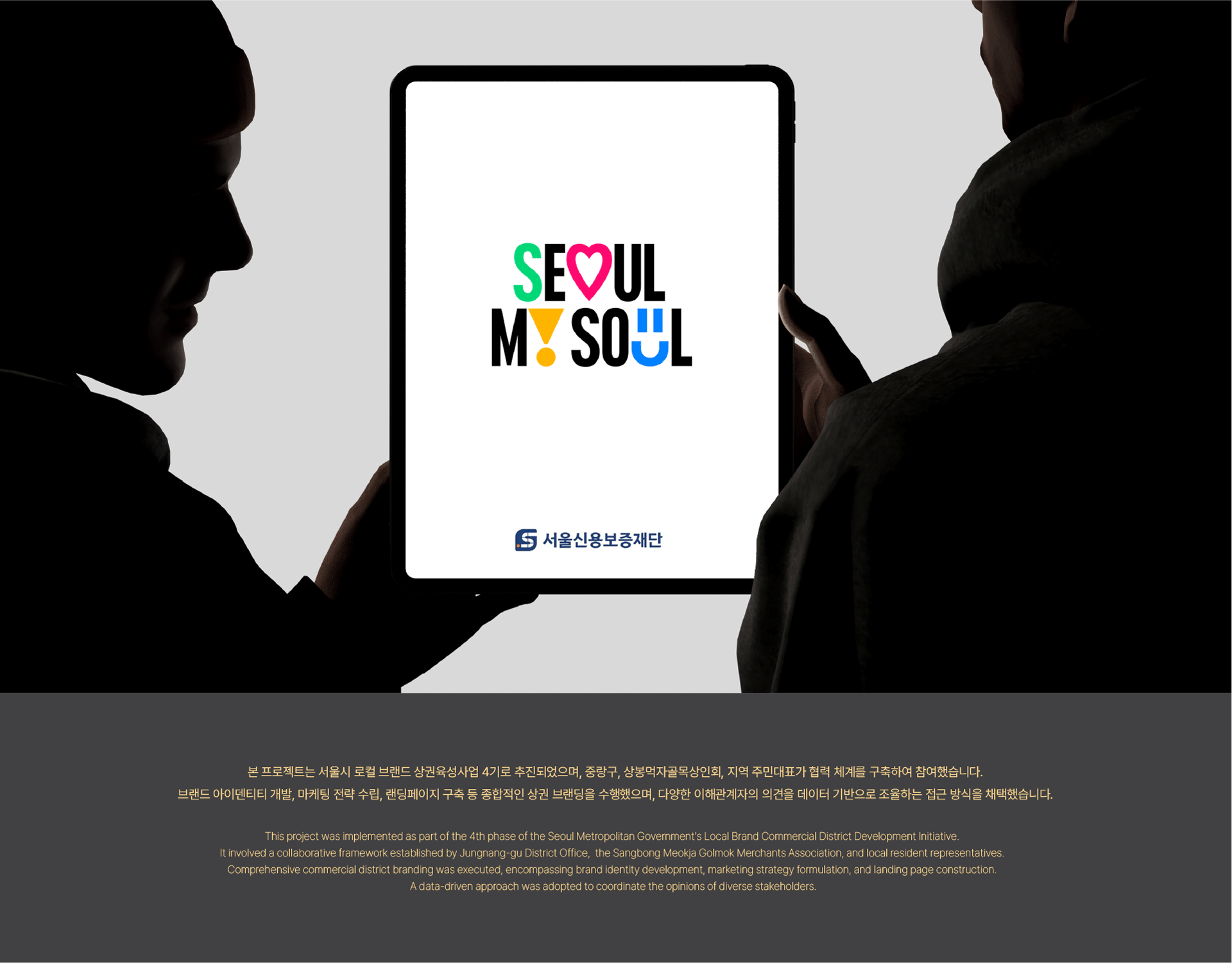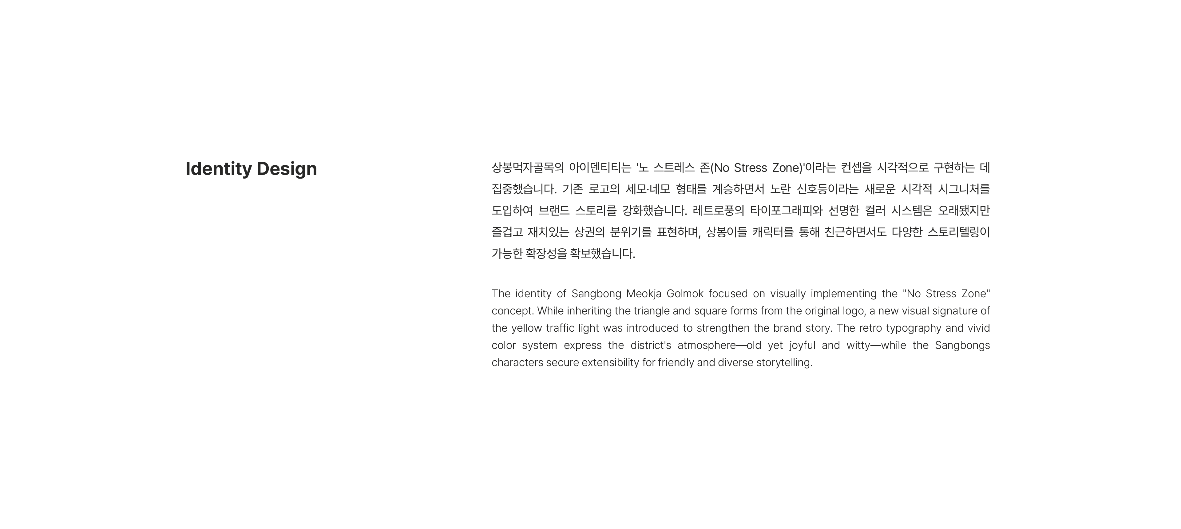 Sangbong Meokja Golmok is a food-specialized alley district located just one minute on foot from Sangbong Station on Seoul Metro Line 3. This project was carried out as part of the Seoul Metropolitan Government's Local Brand Commercial District Development Project (Phase 4). Despite its legal designation as a specialized outdoor dining street, the district suffered from low external recognition and limited new customer acquisition. The project focused on maximizing the district's existing strengths and establishing an identity as a "No Stress Zone" — a place to set aside everyday stress and meet loved ones.