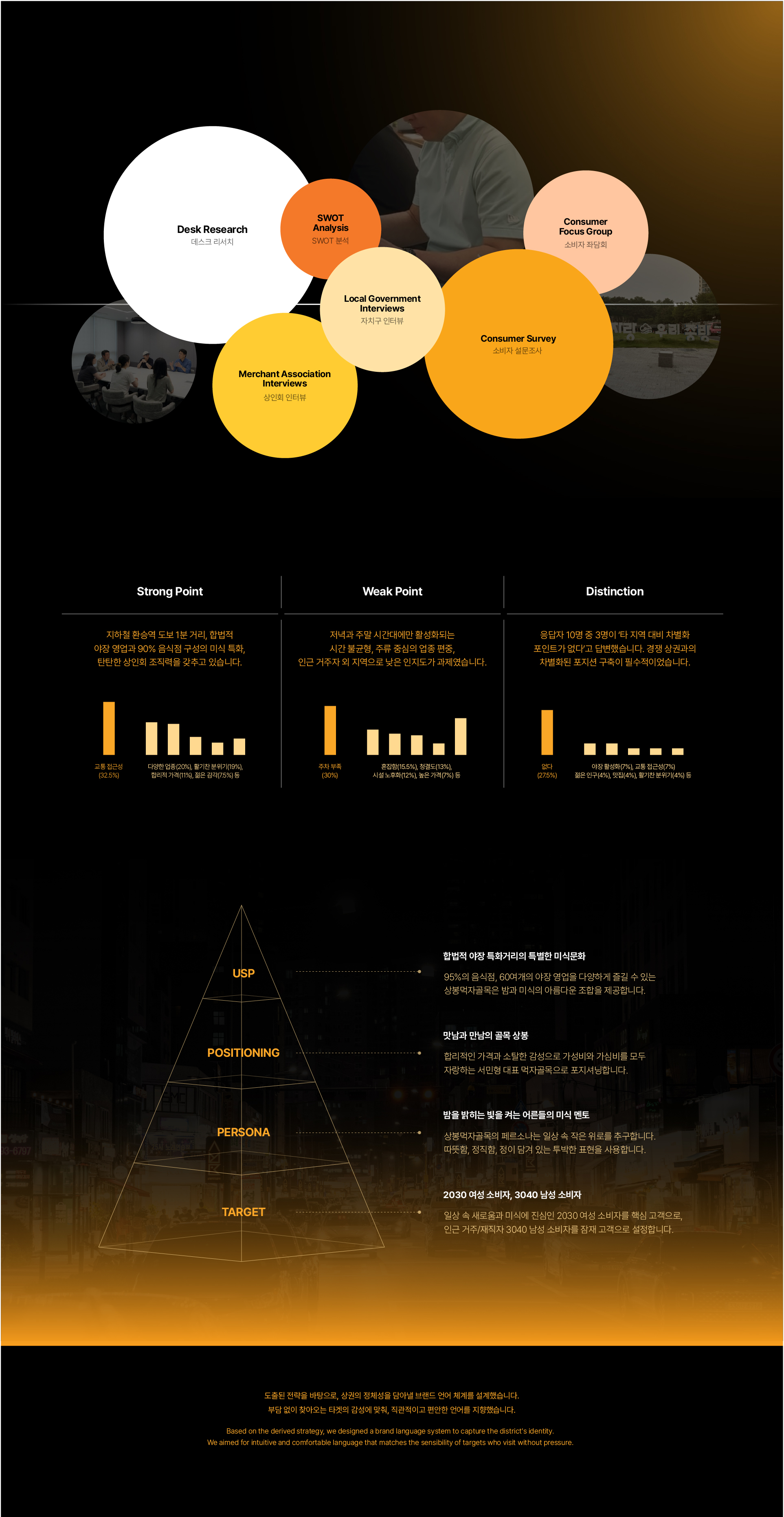 상봉먹자골목은 서울 3호선 상봉역에서 도보 1분 거리에 위치한 미식 특화 골목형 상점가입니다. 서울시 로컬 브랜드 상권육성사업 4기의 일환으로 본 프로젝트가 진행되었으며, 야장 특화거리라는 법적 지위를 확보하고 있음에도 외부 인지도가 낮아 신규 고객 유입이 제한적이었습니다. 본 프로젝트는 이미 활성화된 상권의 강점을 극대화하여, 일상의 스트레스를 내려놓고 소중한 사람과 만나는 '노 스트레스 존(No Stress Zone)'이라는 정체성을 구축하는 데 집중했습니다.